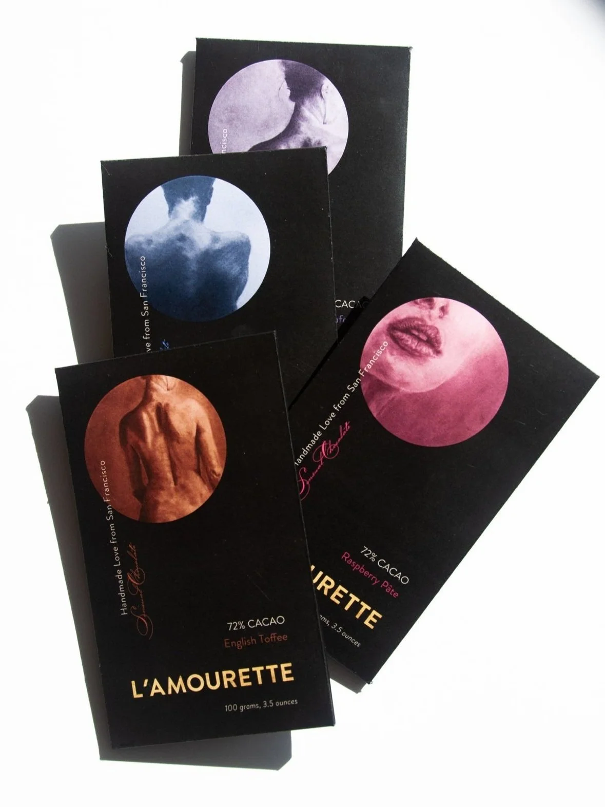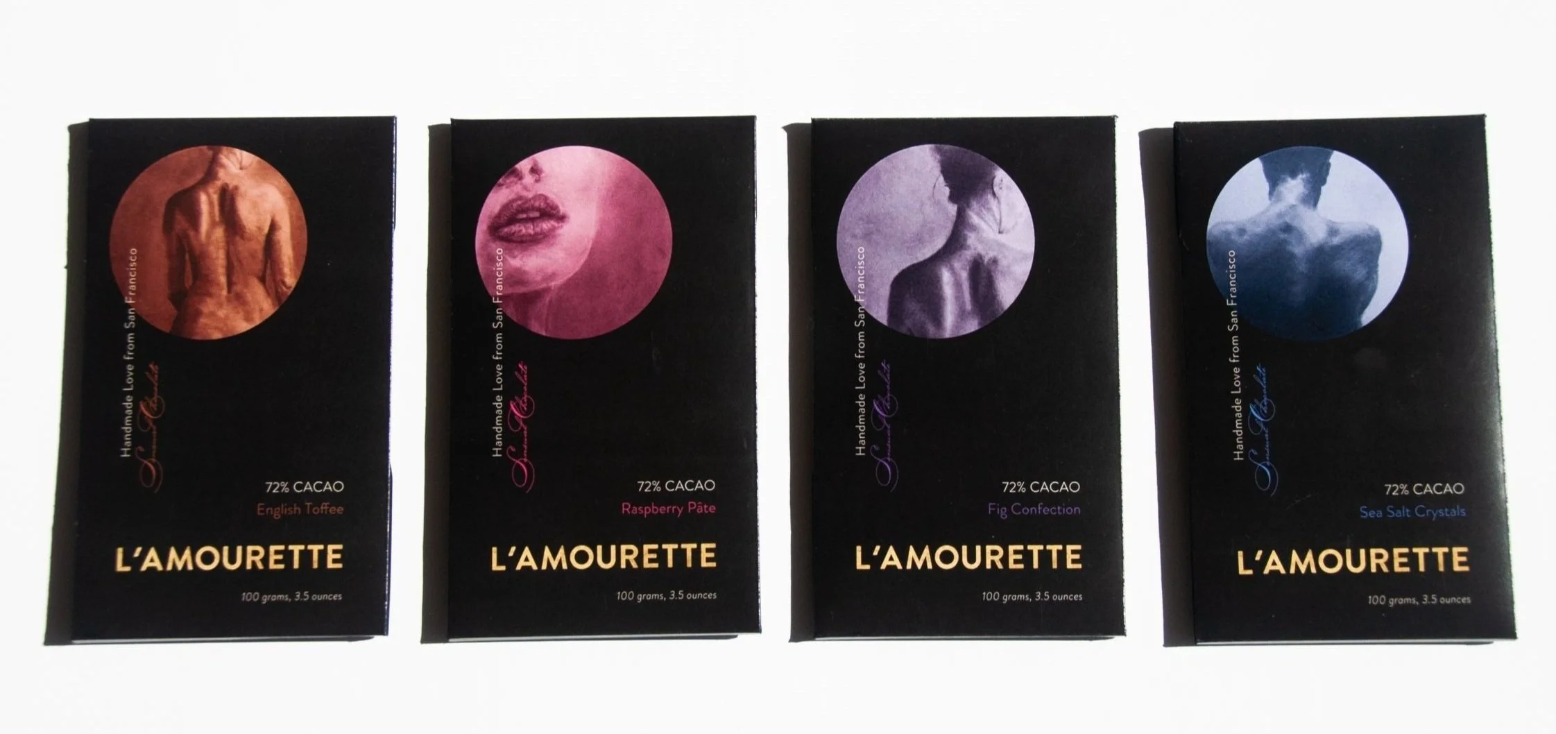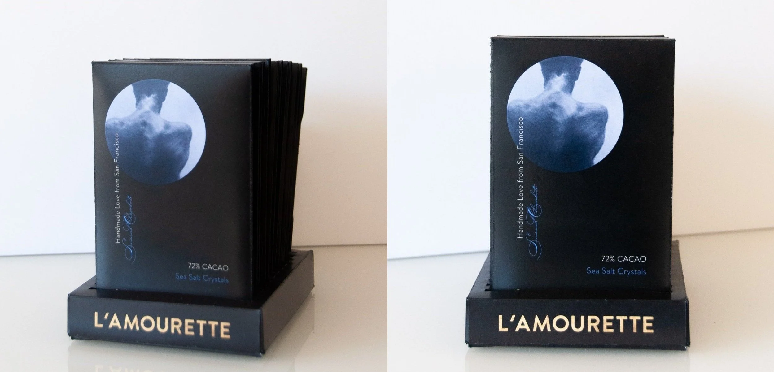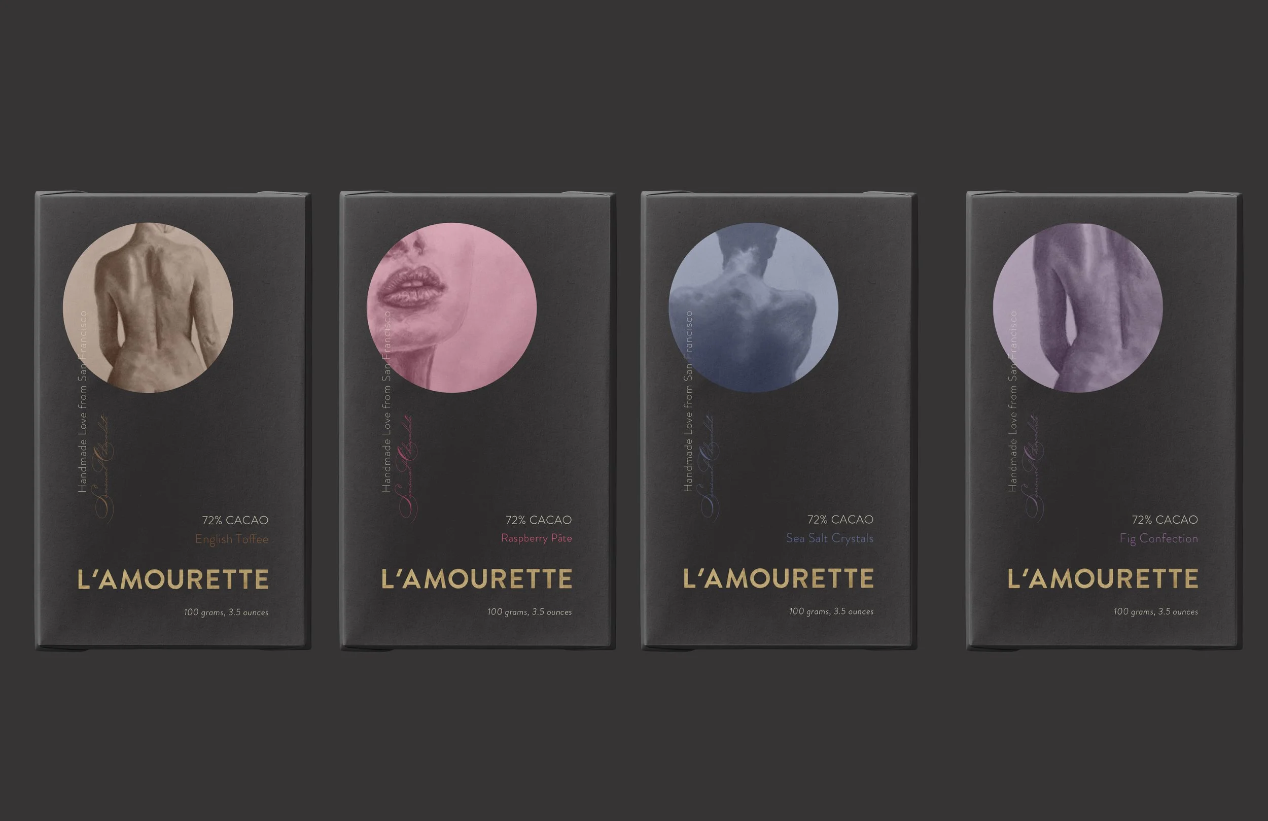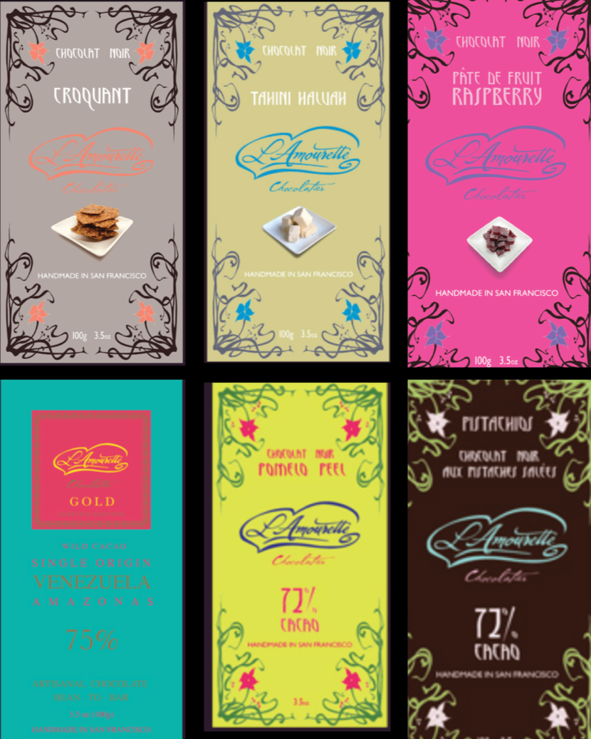 L’AMOURETTE is a local chocolate company in San Francisco that stands for exceptional quality, crafting exquisite chocolate bars from the finest ingredients. Their existing package design failed to align with their distinguished identity. Therefore, a rebranding initiative was vital in order to communicate the value of their high-quality and premium-priced chocolate.