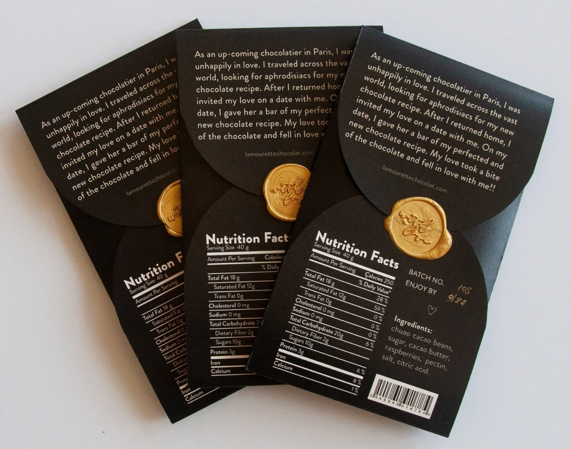 The attention to detail, exemplified by the application of gold foil on the wordmark, a gold wax seal, and the intimate drawings that I drew using charcoal, distinguishes the company from its’ competitors and positions L’AMOURETTE’s chocolate bars as thoughtful and elegant gifts, enhancing the perceived value and justifying the premium price point.