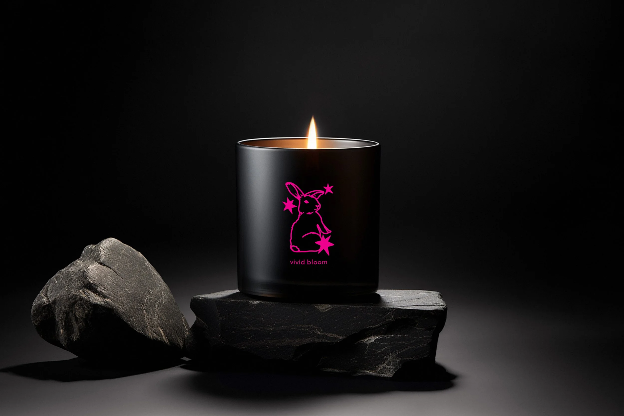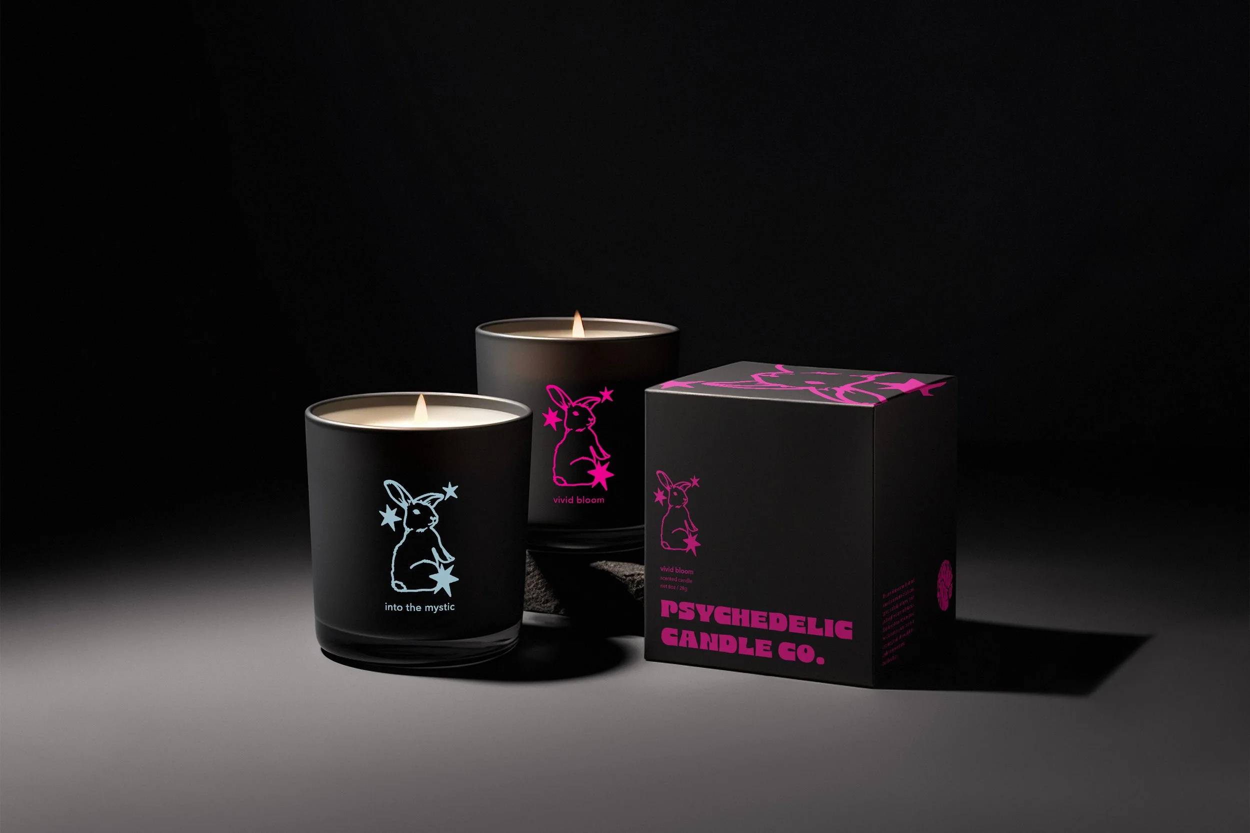 Logo and packaging design for Psychedelic Candle Company. The bunny logo draws from the white rabbit as a point of entry into an altered perception, establishing a visual language that is rooted in psychedelic experience. Expressive, high-contrast color is held in tension with a restrained typographic structure, preserving clarity within slight distortion.