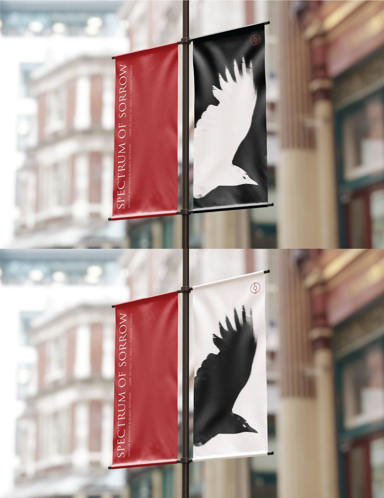 The banner system translates the identity into a vertical, architectural format. A bold red field anchors the composition, carrying the title and essential information with clarity and authority. Adjacent high-contrast imagery extends the visual language established in the posters.